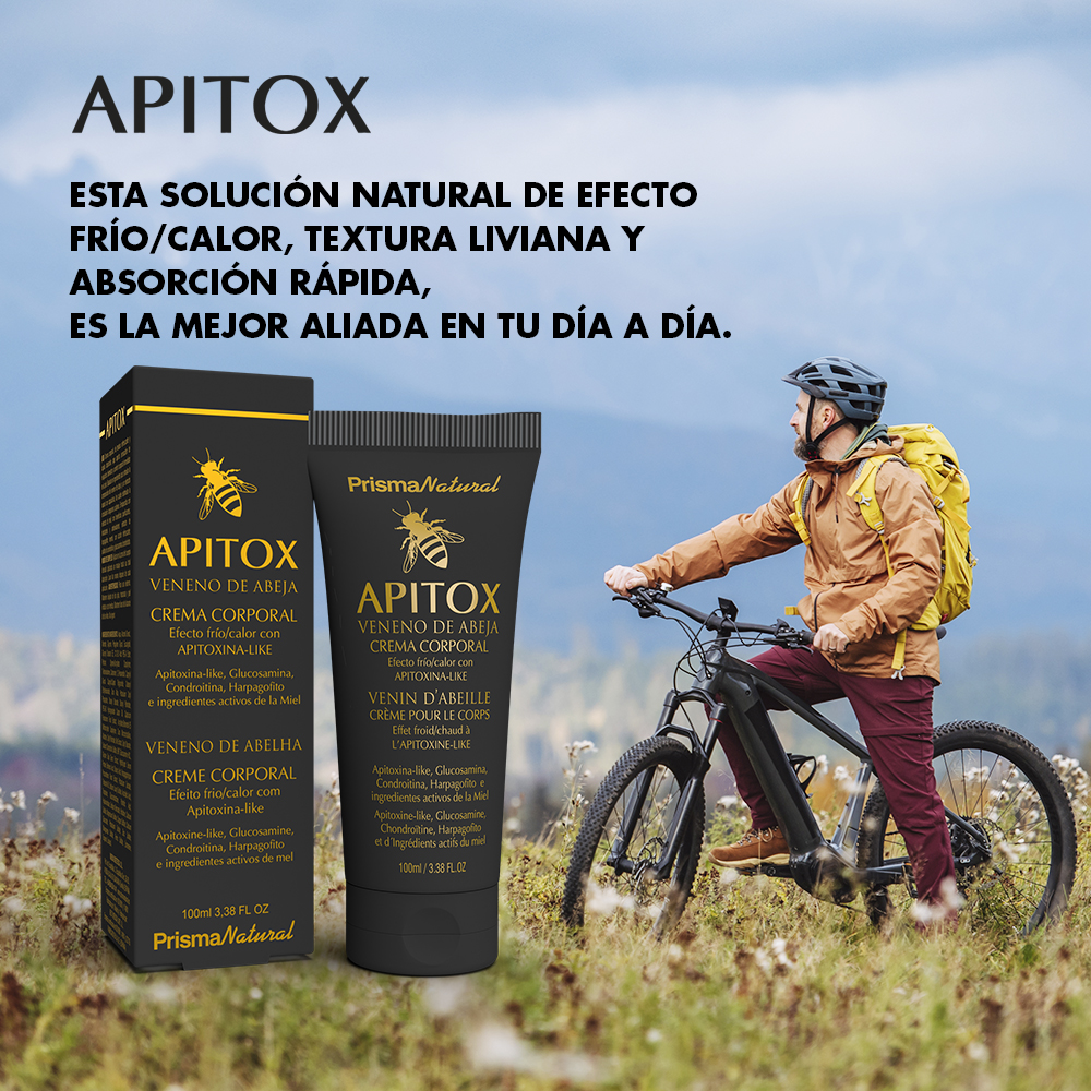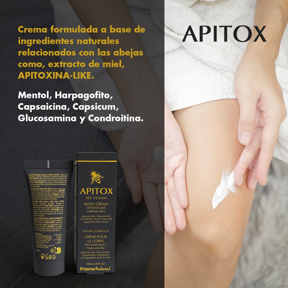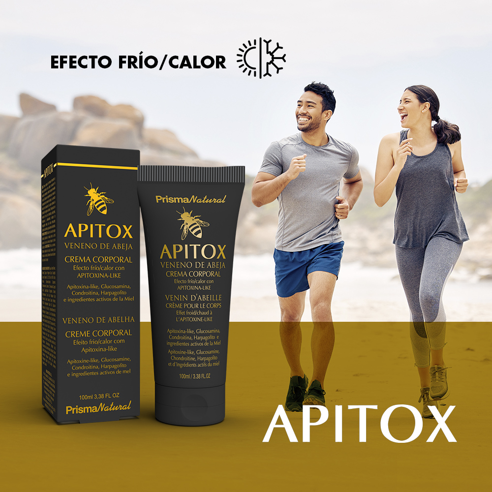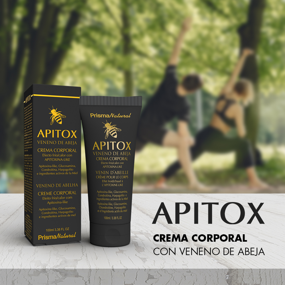 APITOX 100 ml. Es el producto más vendido dentro de la cosmética de Prisma Natural. Se trata de una crema formulada a base de ingredientes naturales relacionados con las abejas como, extracto de miel, APITOXINA-LIKE, la alternativa sostenible al veneno de abeja, procedente de la biotecnología que NO PRESENTA TOXICIDAD, así como Mentol, Harpagofito, Capsaicina, Capsicum, Glucosamina y Condroitina.