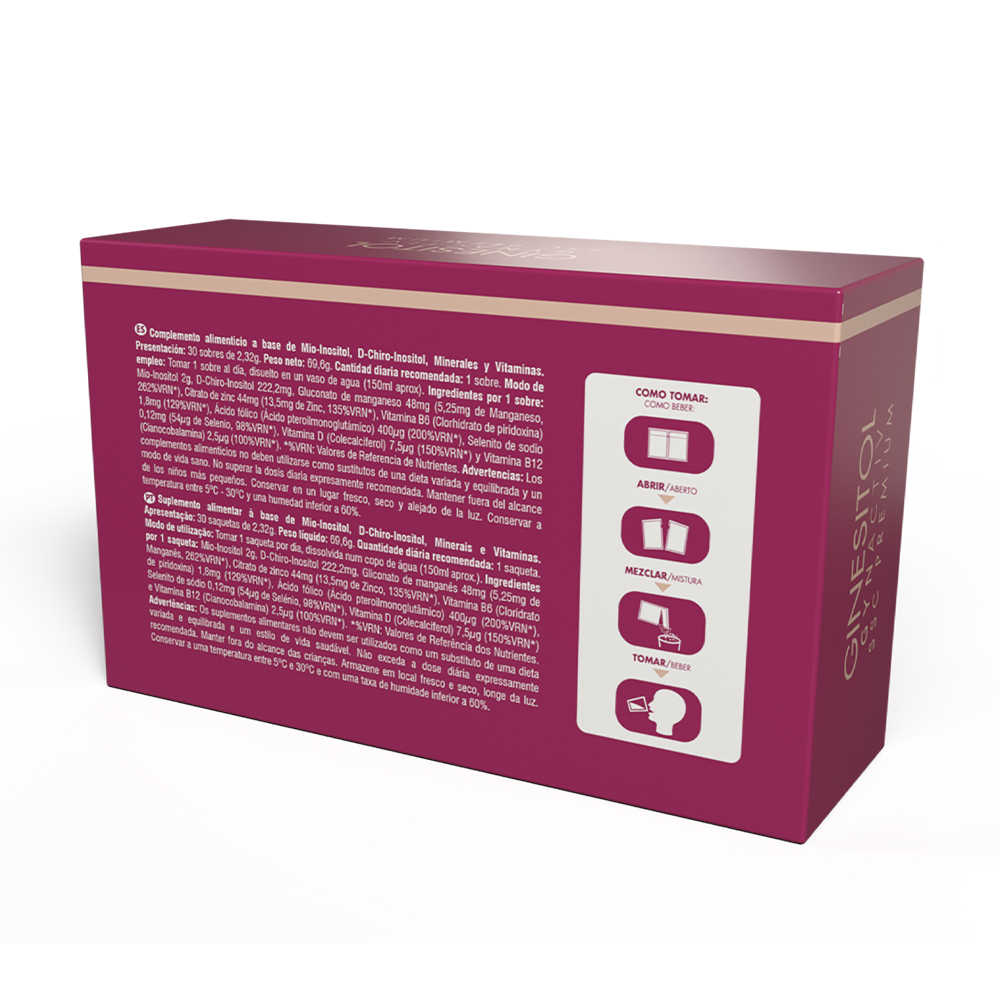 COMPOSICIÓN POR 1 SOBRE: MIO-INOSITOL 2G, D-CHIRO-INOSITOL 222,2MG, GLUCONATO DE MANGANESO 48MG (5,25MG DE MANGANESO, 262%VRN*), CITRATO DE ZINC 44MG (13,5MG DE ZINC, 135%VRN*), VITAMINA B6 (CLORHIDRATO DE PIRIDOXINA) 1,8MG (129%VRN*), ÁCIDO FÓLICO (ÁCIDO PTEROILMONOGLUTÁMICO) 400μG (200%VRN*), SELENITO DE SODIO 0,12MG (54μG DE SELENIO, 98%VRN*), VITAMINA D (COLECALCIFEROL) 7,5 G (150%VRN*) Y VITAMINA B12 (CIANOCOBALAMINA) 2,5μG (100%VRN*). *%VRN:Valores de Referencia de Nutrientes.