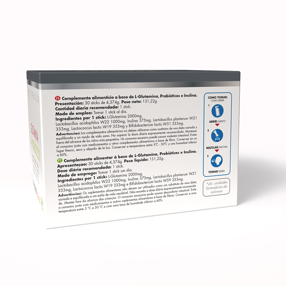 COMPOSICIÓN POR 1 STICK: L-GLUTAMINA 2.000MG, LACTOBACILLUS ACIDOPHILUS W22 1.000MG, INULINA 375MG, LACTOBACILLUS PLANTARUM W21 333MG, LACTOCOCCUS LACTIS W19 333MG Y BIFIDOBACTERIUM LACTIS W51 333MG.