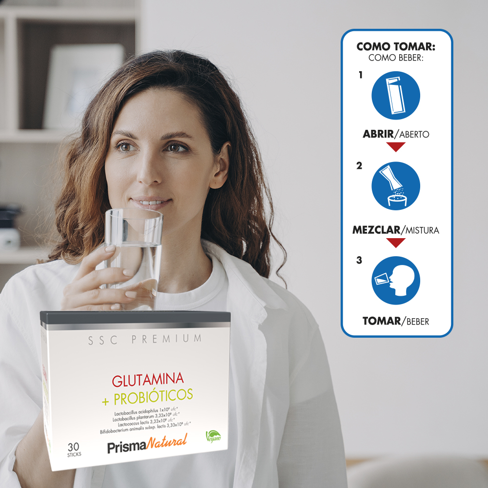 Glutamina + Probióticos, 30 stick es un complemento alimenticio de la línea Premium de Prisma Natural.